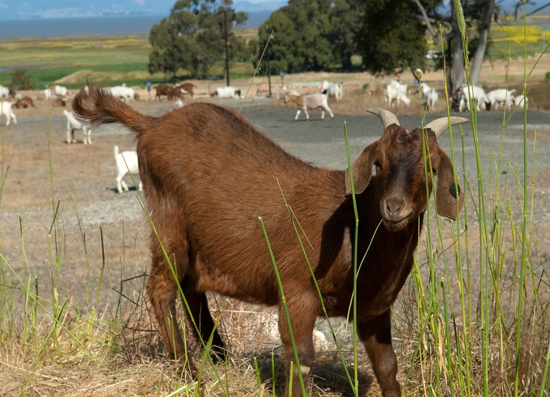 Deployed before fire season begins, hundreds of goats are released to graze on invasive species to limit the growth and flammable biomass by the time fire season starts. A herd of a hundred goats, oftentimes accompanied by a goatherd and herding dog, can graze up to an acre every day.