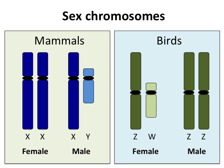 The opposite occurs in birds, who have Z and W sex chromosomes. Females have individual Z and W copies, and males have two Z copies. When two birds mate, the male passes on Z chromosomes, while the female egg will have either the Z or the W chromosome.